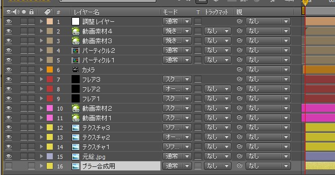 これらのエフェクトはタイムラインに沿って強くしたり、弱くしたり、動かしたりできます シャターやParticular、動画素材などは1フレームごとに変化しますので、バランスを見て絵に合った部分を探します(ちょっと今回はシャターを散りばめすぎたような気もしますが…;)